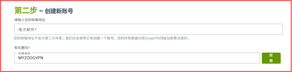 输入正确邮箱(此处不设密码,系统会将默认密码发至邮箱)。在优惠码栏输入 “MYZOOGVPN”,点击应用,立享85折优惠