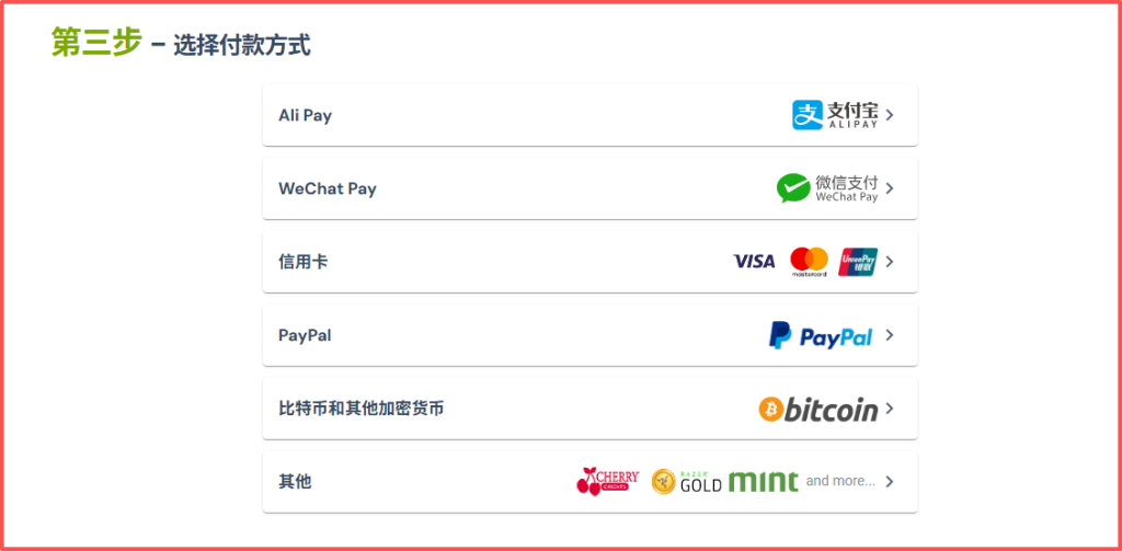 - 付款方式:支持支付宝/微信/银联/PayPal/加密货币等支付方式